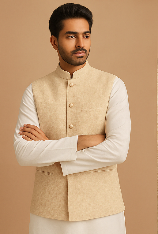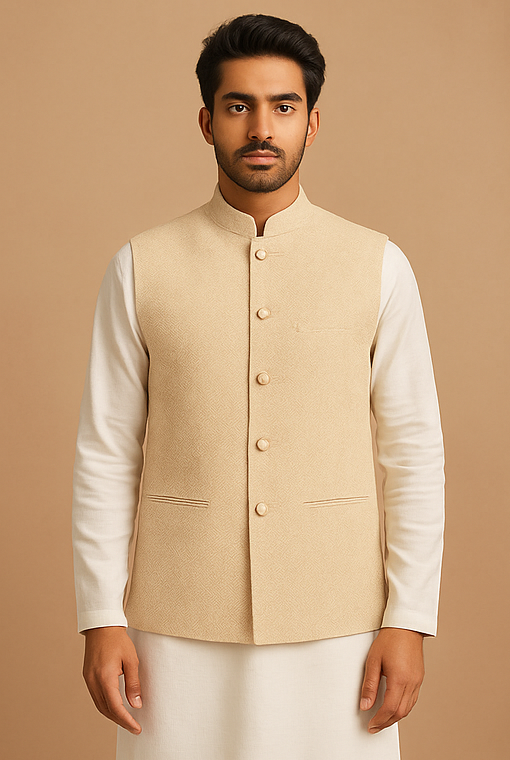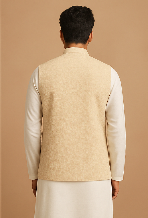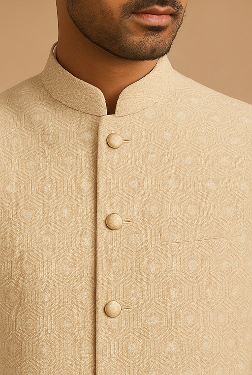 Understated yet undeniably elegant, the Desert Ivory Hex Weave Waistcoat is designed for the discerning gentleman who values timeless texture. Crafted in a soothing beige hue with a subtle geometric hexagon jacquard, this piece blends modern design with traditional finesse. The minimalist tone-on-tone buttons and structured Nehru collar enhance its refined aesthetic.