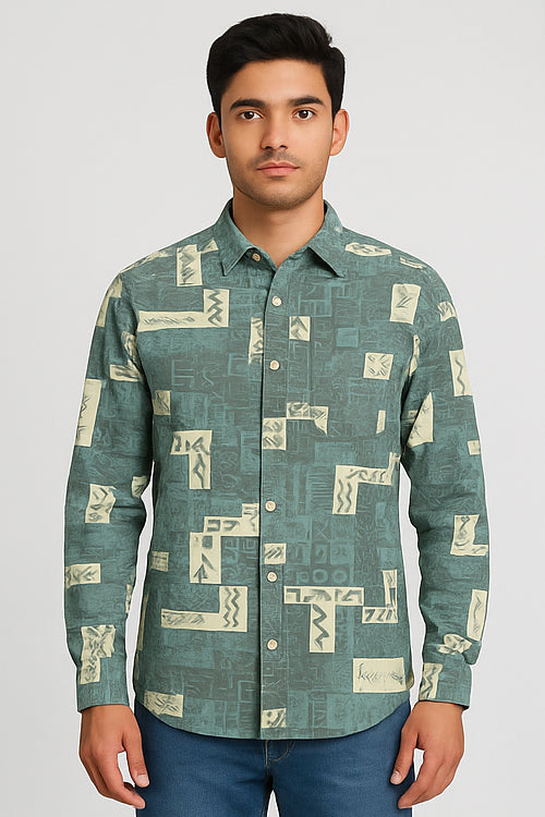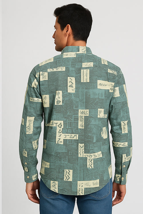Make a bold cultural statement with the Tribal Rhythm Print Shirt. Featuring abstract and tribal-inspired motifs in a unique beige-on-teal palette, this shirt is a head-turner for casual days and evening hangouts. The short sleeves and breathable blended fabric ensure comfort with style.